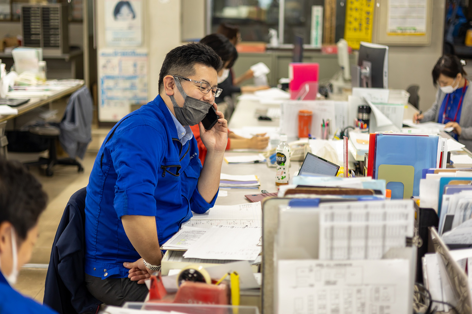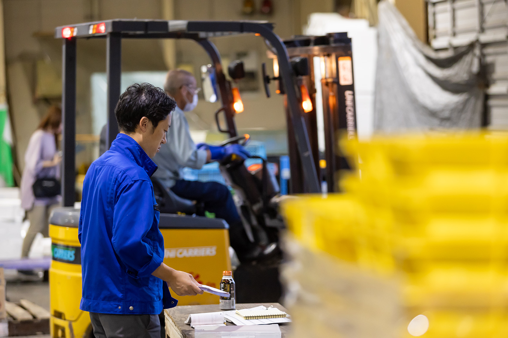 市場で競り。終了後事務所に戻り、伝票整理やメーカー、顧客対応。商談の場合は社有車で訪問。